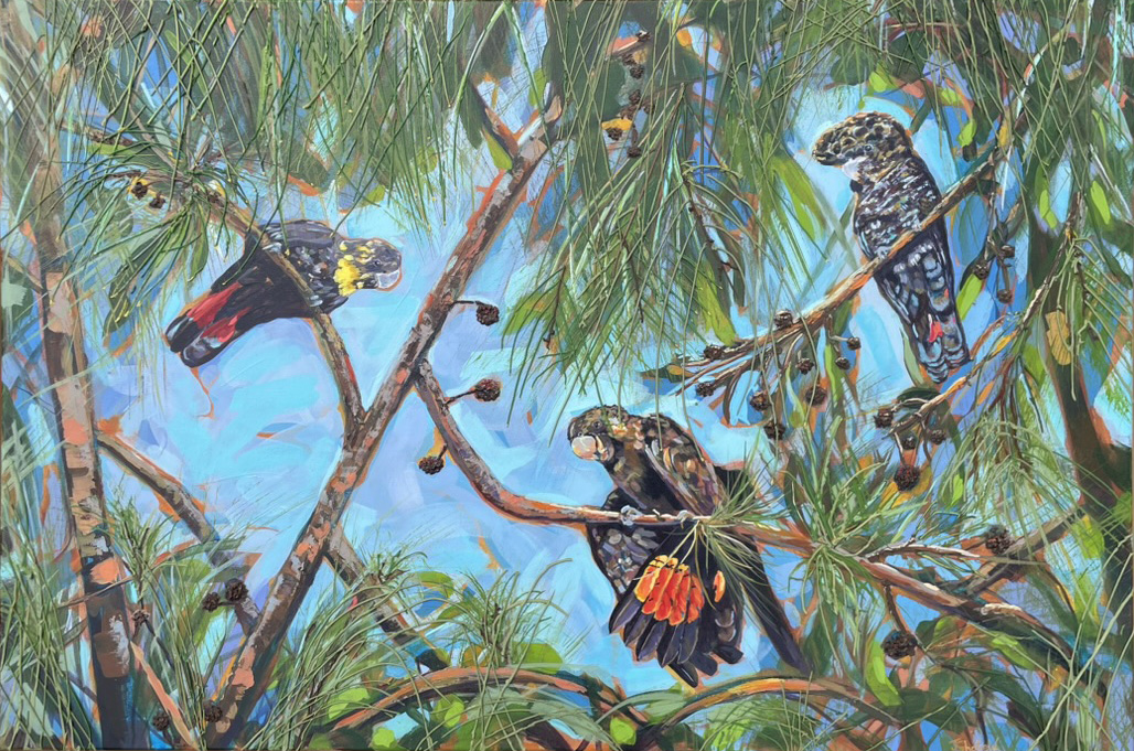 Glossy Trio, Two female and one male KI glossy black cockatoos feeding in casuarina tree.