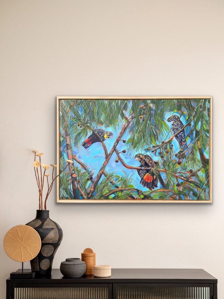 Acrylic paint and texture on stretched canvas, sealed with gloss varnish, signed on the front, ready to hang, Pine floating frame 65cm (H) x 95cm (W) 5cm (D)